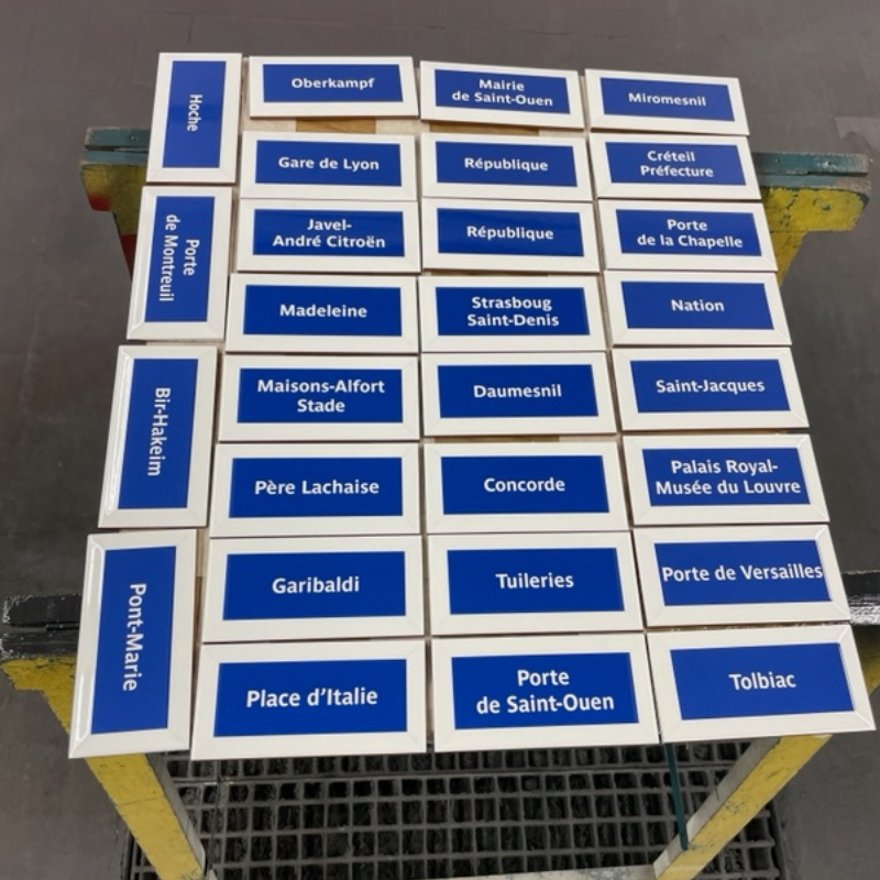 Chaque carreau commence par un support en céramique blanche de haute qualité, sur lequel des motifs de stations parisiennes sont imprimés via une technique UV avancée. Le processus est couronné par un vernissage unique (méthode gardée secrète) qui confère aux carreaux leur finition lustrée et durable, rendant chaque pièce non seulement belle mais aussi résistante.